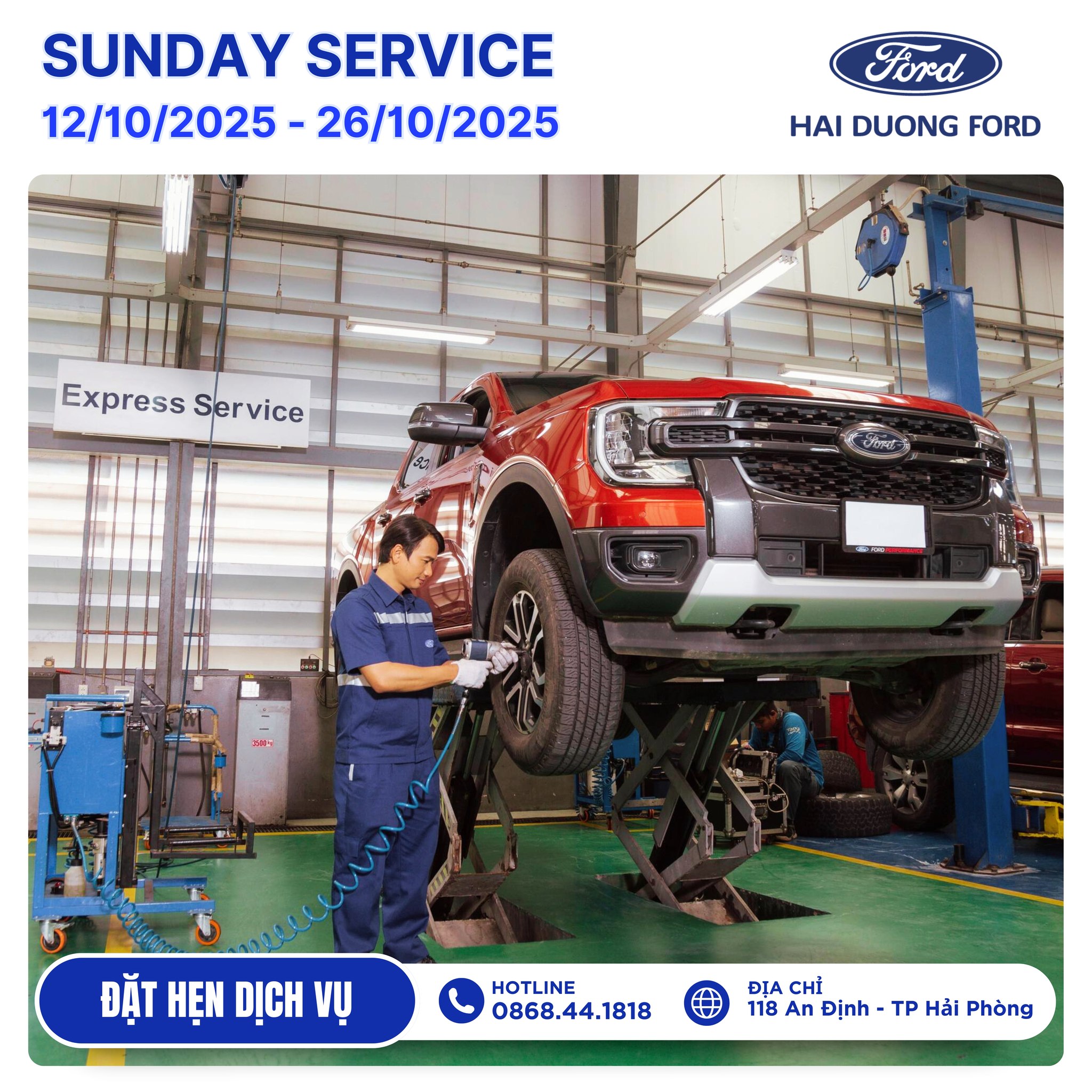 Nhằm tăng cường phục vụ cho Quý khách hàng bận rộn không thể đem “xế yêu” đến làm dịch vụ trong tuần, Hải Dương Ford thông báo mở cửa các ngày Chủ Nhật để phục vụ Quý khách có nhu cầu sử dụng dịch vụ cuối tuần: